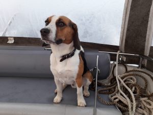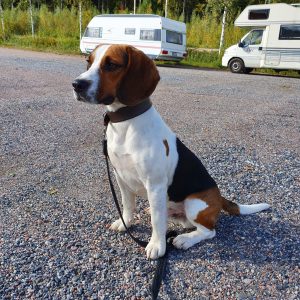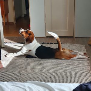 Beaglet pystyvät moneen. Alla Ressu avustamassa isäntää tietokonehommissa ja Mörkö näyttämässä aamujoogan mallia. Emppu veneilee isäntäväen kanssa.