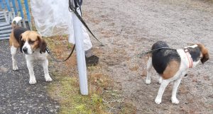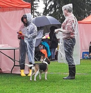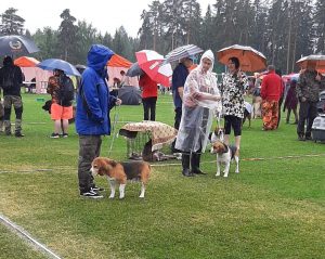 Rutusta ei tullut otettua parempaa kuvaa kuin alla oleva. Omat koirat odottivat vuoroaan kaiteeseen sidottuina eivätkä piitanneet tarjotuista sateenvarjoista. Ruttu vasemmalla ja Vimma oikealla.