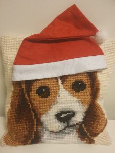 Kuvassa ystävän tekemä tyyny jouluasussa.