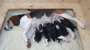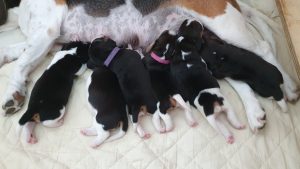 Pennut ovat nyt 5 vrk:n vanhoina nostaneet painoaan n. 200 g. Kaksi pienempää painoi syntyessään n. 250 g ja muut n. 325 g eli ne ovat nyt keskimäärin puolikiloisia. Ruskeaa väriä on tullut päihin ja emän nisät löytyvät varmasti. Vimmakin on selvinnyt hormonihuuruistaan omaksi itsekseen.