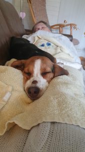 Ja toinen emännän vatsalla makupala nenän päällä, molemmat sikeässä unessa lastenlasten lomaviikolla.
