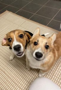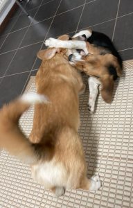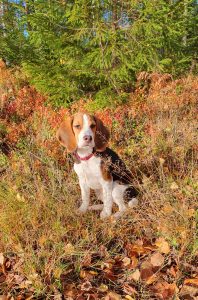 Terttu viihtyy hyvin metsällä ja nauttii corki-pennun seurasta.