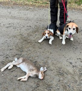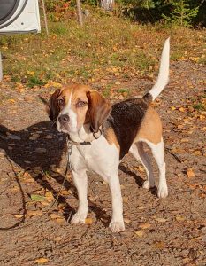 Arto näki Rutun ajaman ja tielle hukkaaman jäniksen hyppäävän tien sivuun. Hän antoi jäljen vähän jäähtyä ennen kuin laski Hipan tielle. Sepä selvitti nopeasti jäniksen makuupaikan, otti sen ylös ja haukkui ajoäänellä n. 10 min. Ikää oli 5 kk 9 pv, aika sama kuin Vimmalla aikoinaan. Alla kuva Hipasta: